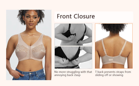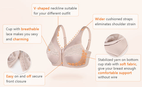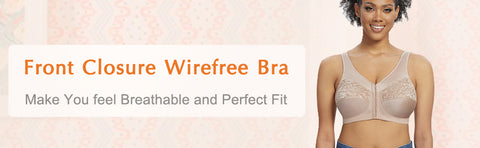 - ront Closure & Wirefree Design With front closure, is easy to put on and off. You don't need to reaching behind your back to clasp. Suitable for the elderly, the lady who have undergone surgery, or someone with arm pain.